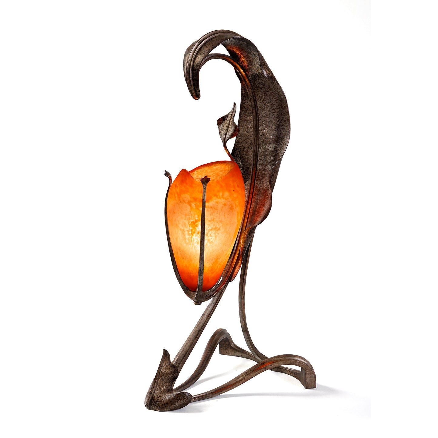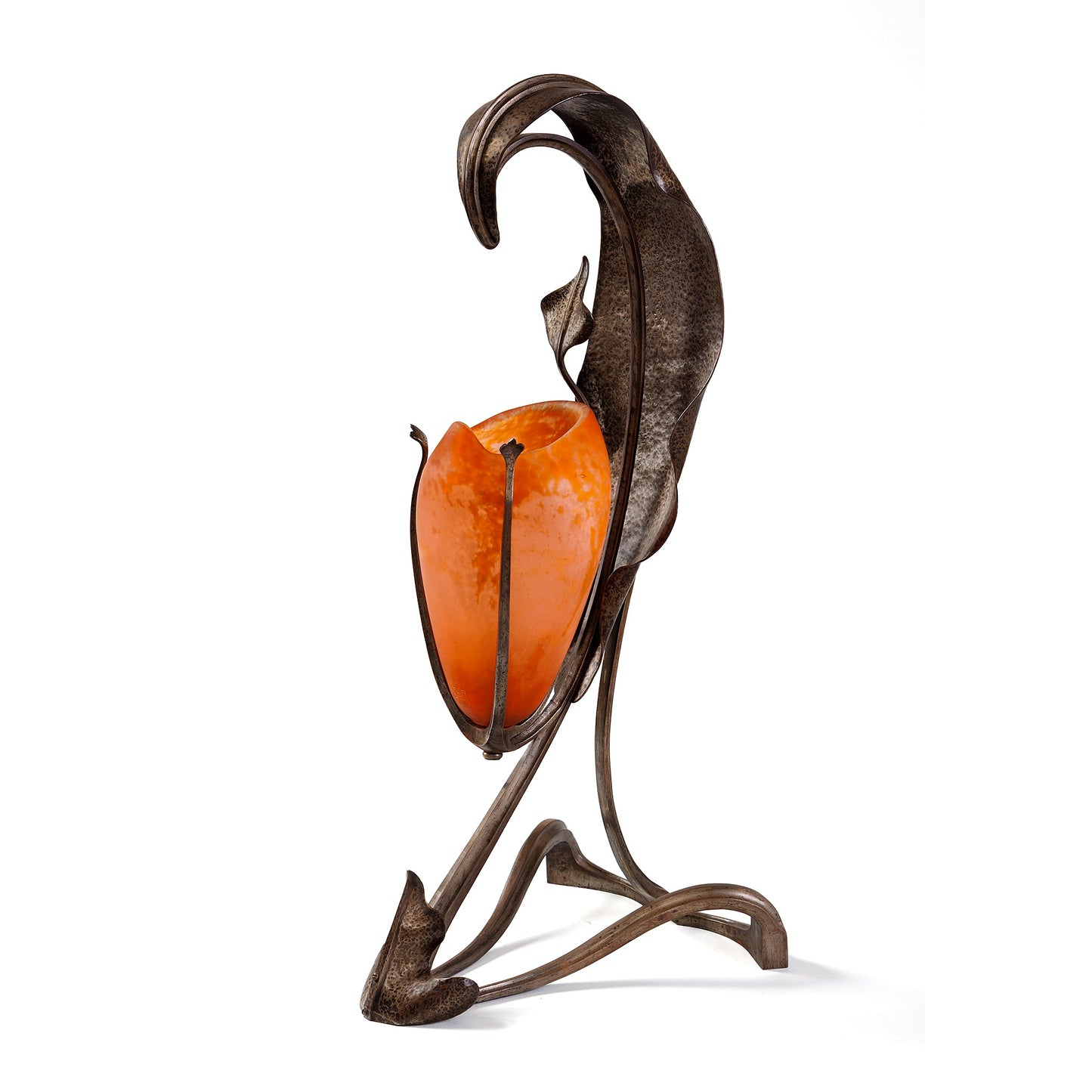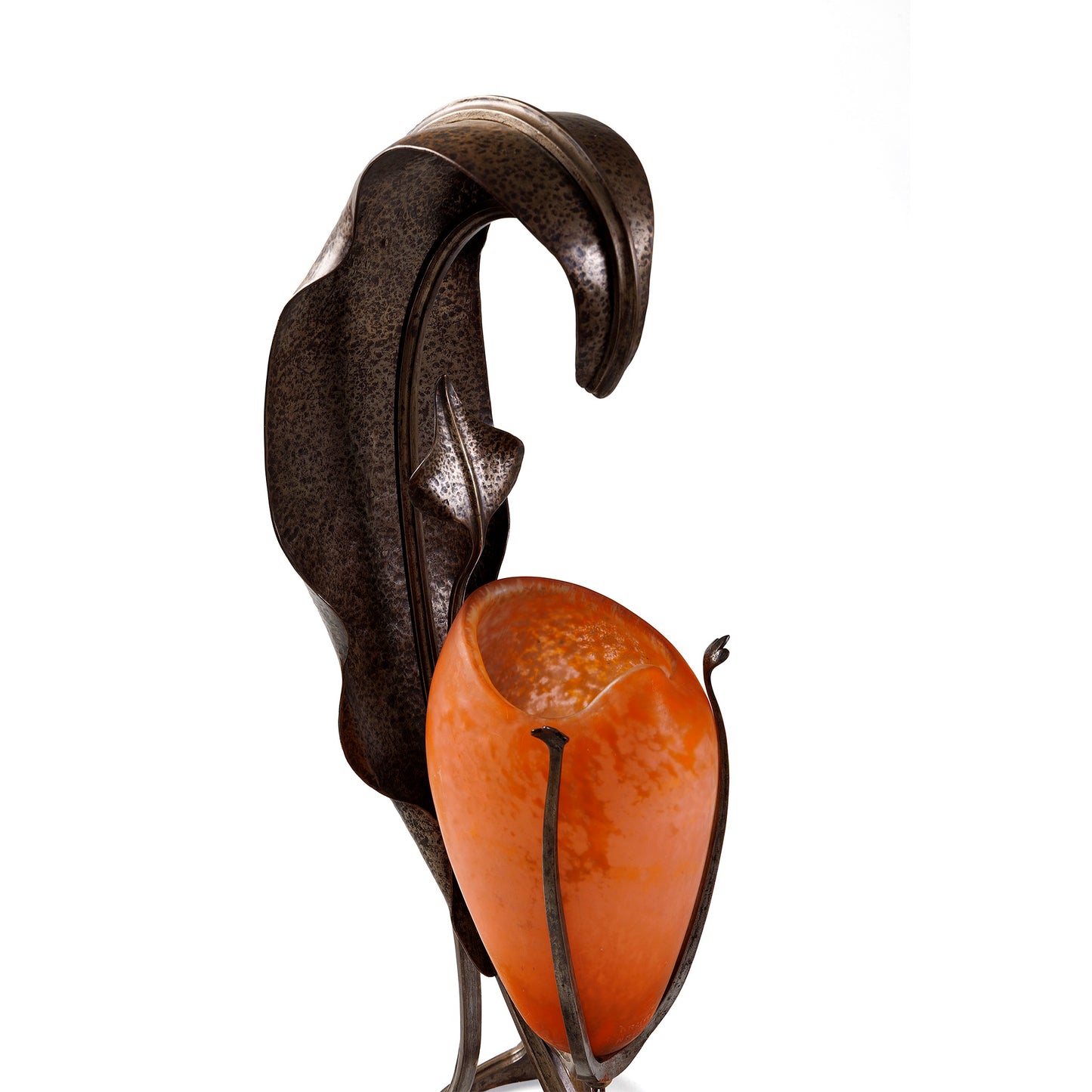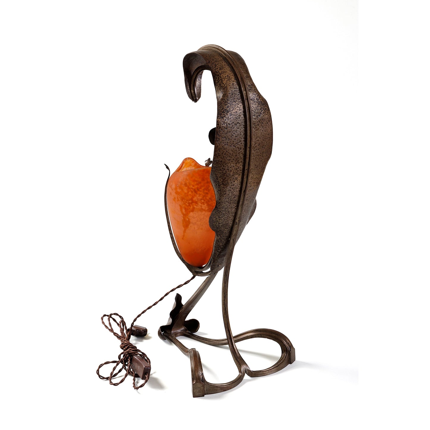 This 'Orchidée' table lamp, a collaboration between Majorelle and Daum, depicts Nepenthes ascidia, a tropical pitcher plant native to British Ceylon. Rendered in patinated, hammered wrought iron and topped with an orange-pink marmorated glass shade, the lamp evokes the plant’s distinctive form. The species rose to prominence after Charles Darwin featured it in Insectivorous Plants, the first major study to recognize the ecological function of carnivorous flora. Its alluring yet predatory character aligned with Art Nouveau’s fascination with seductive, dangerous plants—natural counterparts to the femme fatale.