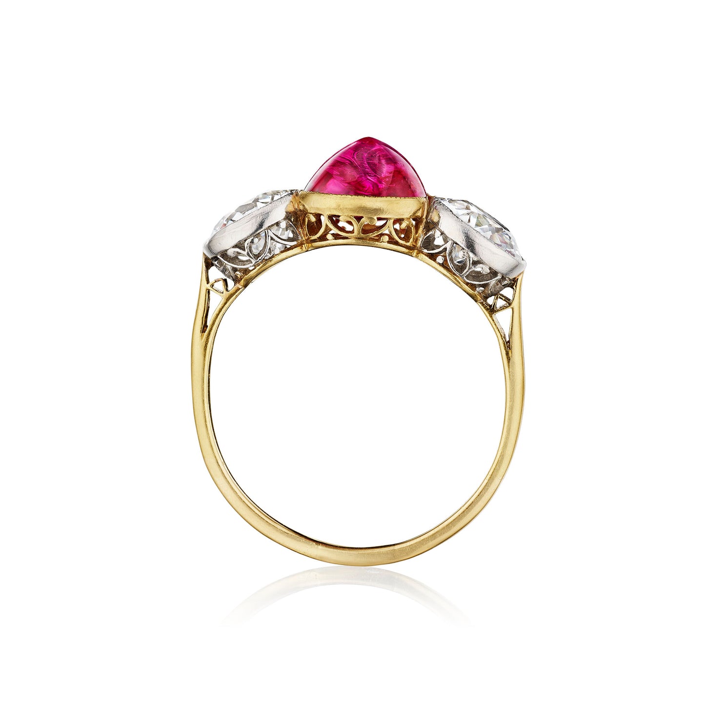 Materials: 1 sugarloaf cabochon ruby (approximate total weight 3.30 carats); 2 old European-cut diamonds (weighing approximately 1.01 and 1.12 carats, color and clarity I/J and VS/SI); platinum topped 18k gold