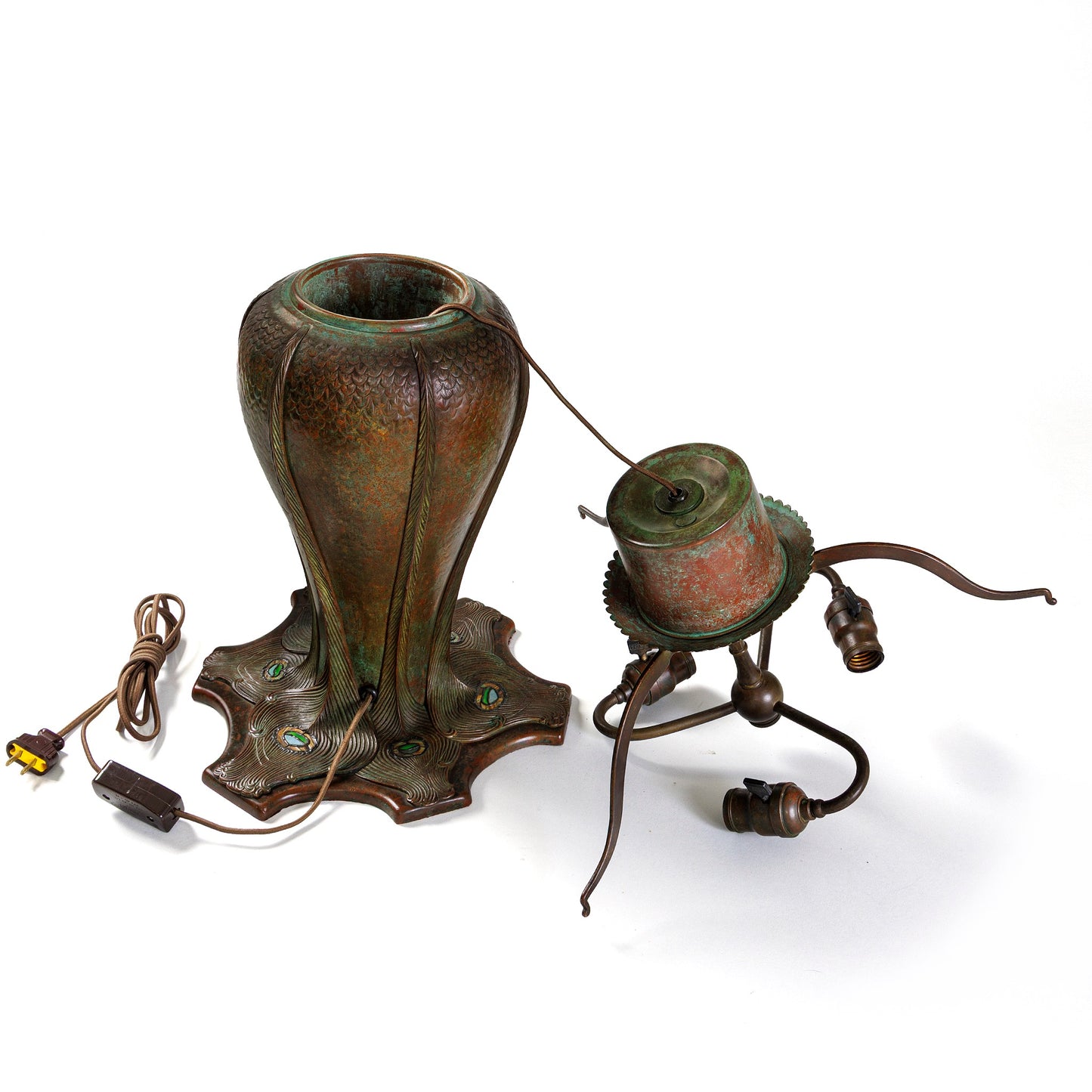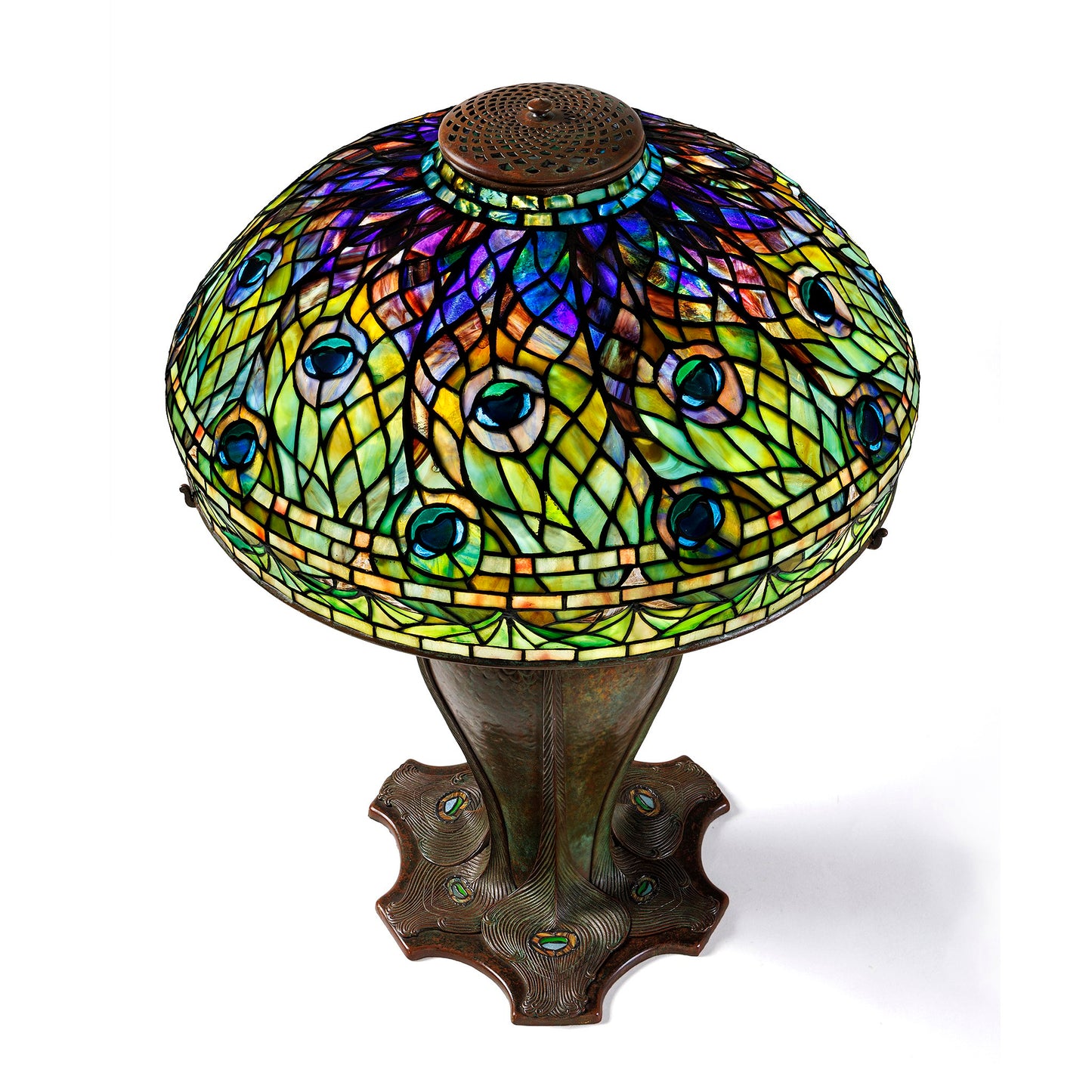 Literature: A similar lamp is pictured in: The Lamps of Tiffany, by Dr. Egon Neustadt, New York: The Fairfield Press, 1970, p. 139, plate 197. The shade is also pictured in: Tiffany Lamps and Metalware: An illustrated reference to over 2000 models, by Alastair Duncan, Woodbridge, Suffolk: Antiques Collectors’ Club Ltd., p. 142, cat. 592.