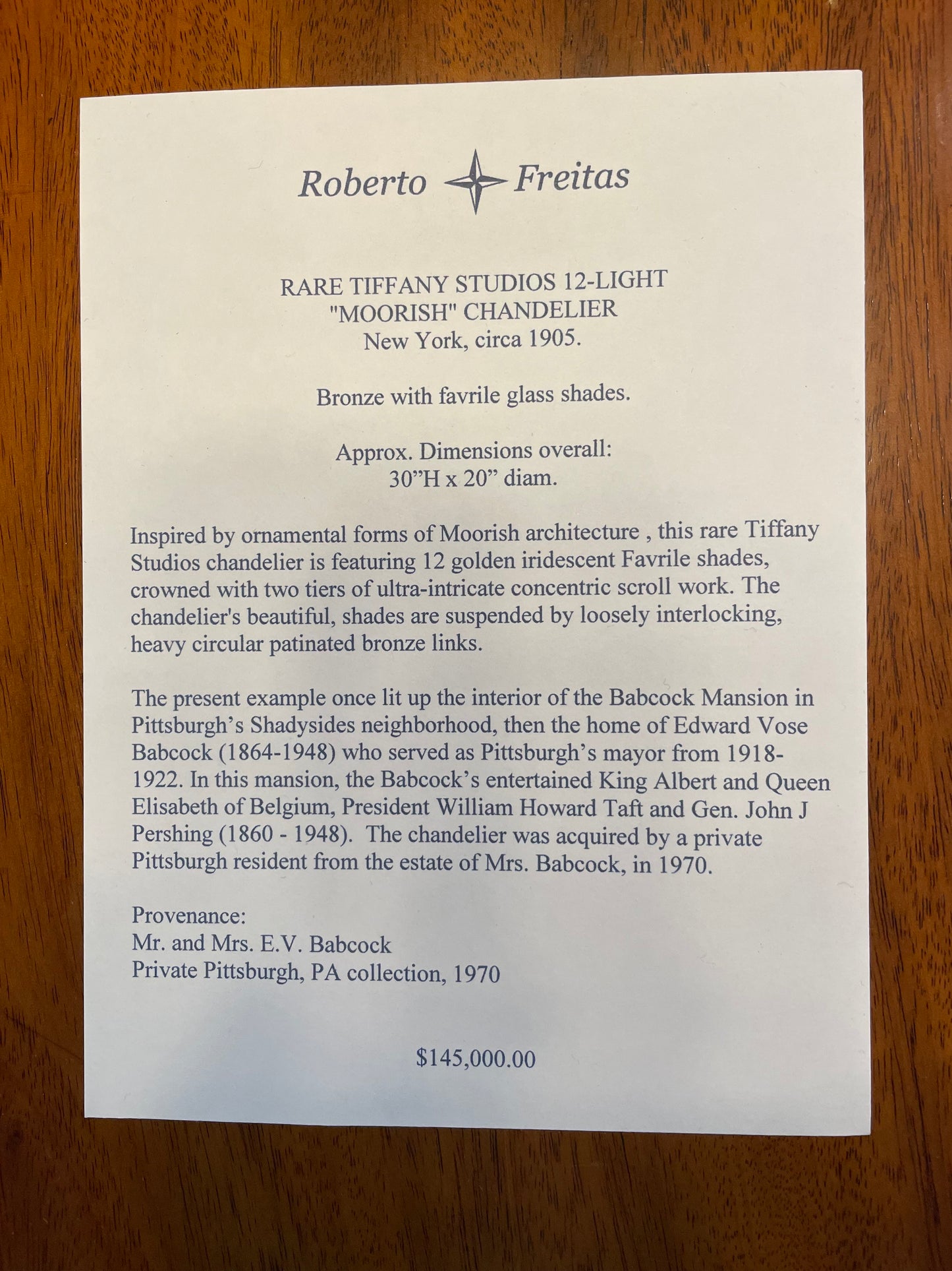 Provenance: The present example once lit up the interior of the Babcock Mansion in Pittsburgh's Shadysides neighborhood, then the home of Edward Vose Babcock (1864-1948) who served as Pittsburgh's mayor from 1918- 1922. In this mansion, the Babcock's entertained King Albert and Queen Elisabeth of Belgium, President William Howard Taft and Gen. John J Pershing ( 1860 -1948). The chandelier was acquired by a private Pittsburgh resident from the estate of Mrs. Babcock, in 1970.